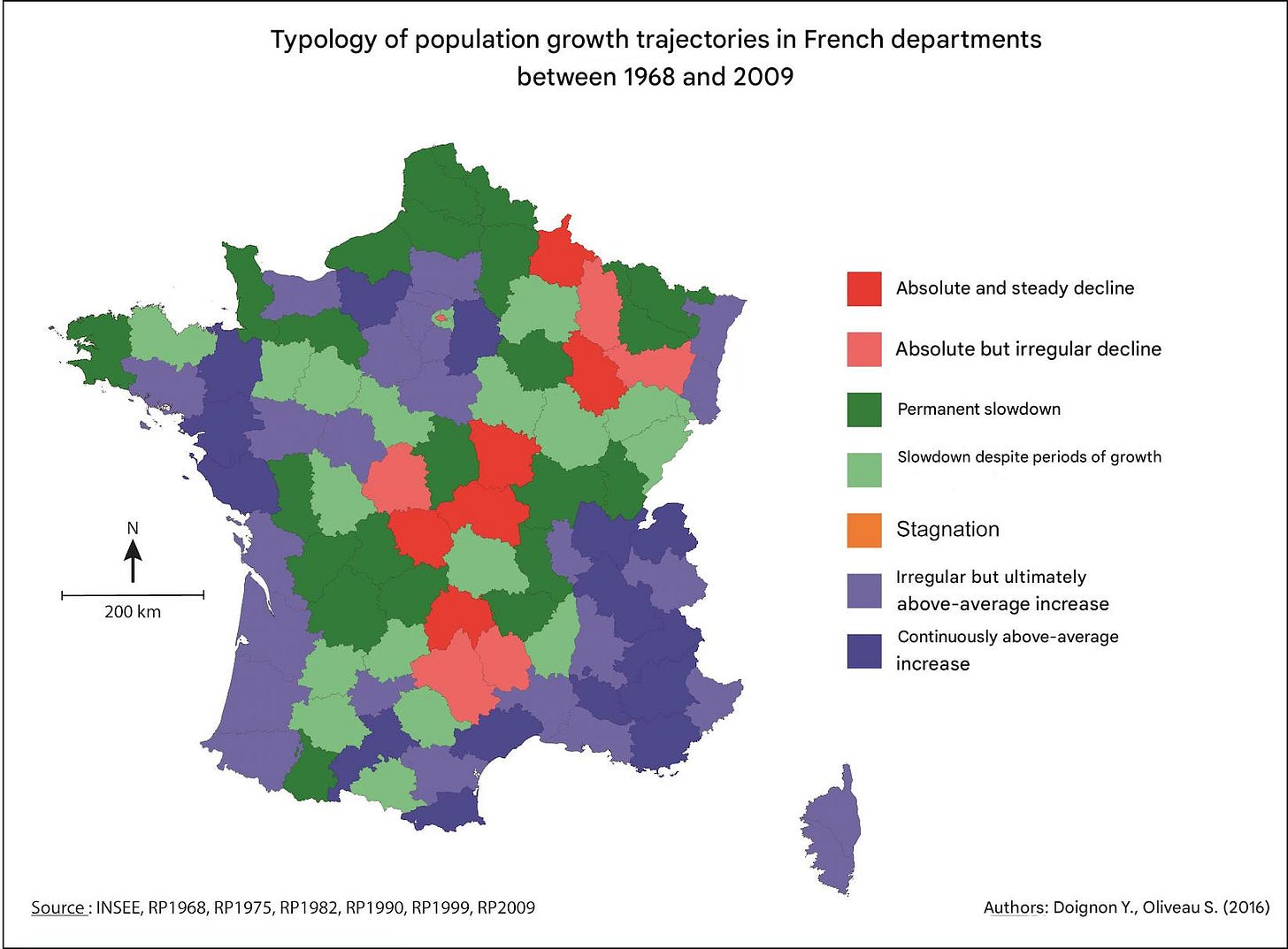 At its 1884 congress, the Société des Géographes Français - concerned about the exode rural - warned about the depopulation and demographic stagnation of vast areas of the country. A few decades later, in the same intellectual milieu, the father of French geography Paul Vidal de la Blache explored his interest in the relationship between man and his environment in his 1904 book Tableau de la géographie de la France1. He paid particular attention to how industrialization and rapid urban growth were reshaping settlement patterns.