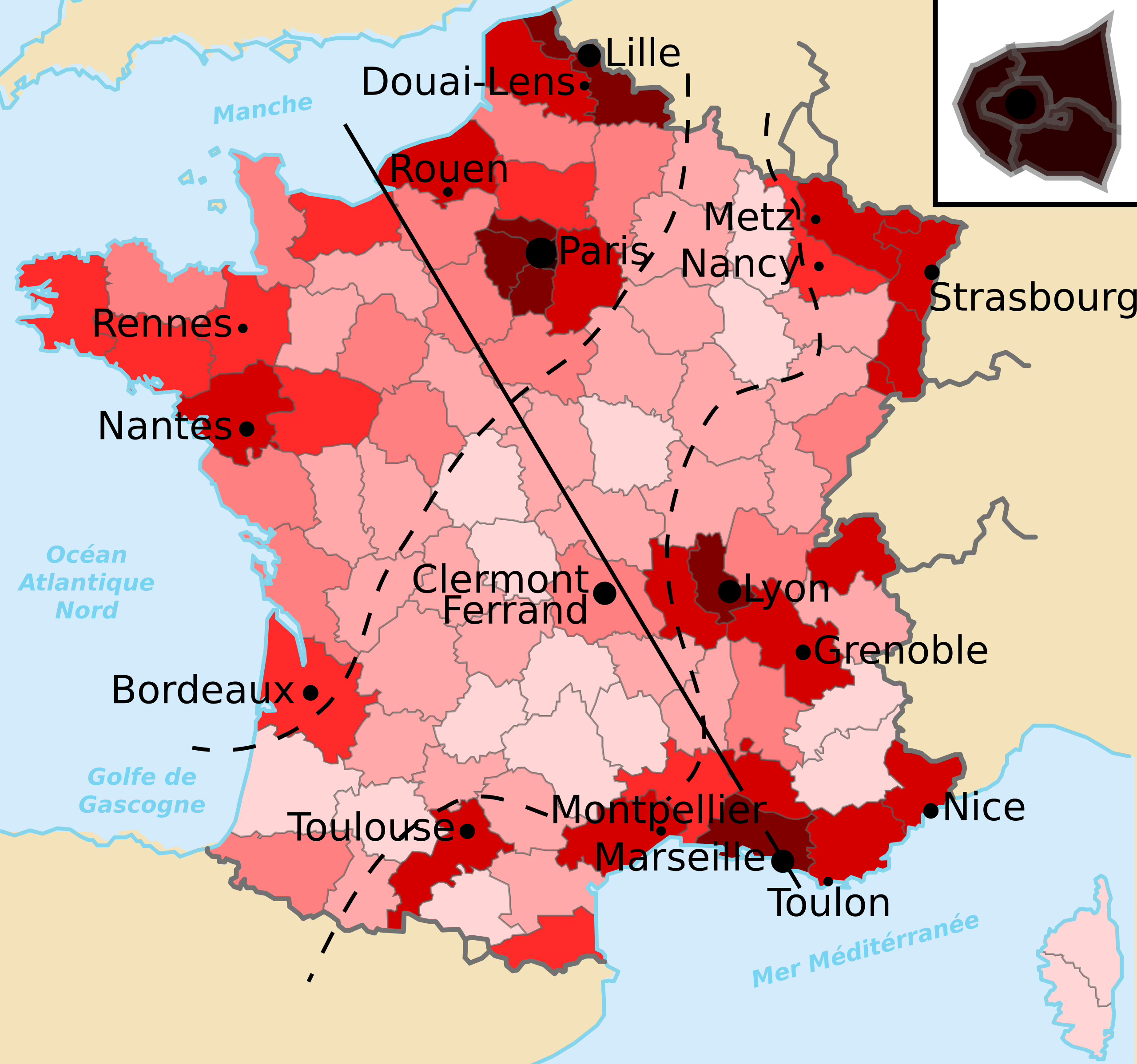 Along with these policies, French geographers popularized a new divide called the Le Havre–Marseille line, separating more dynamic eastern areas from agricultural western ones, to the east of which about 60 % of the French population lives.