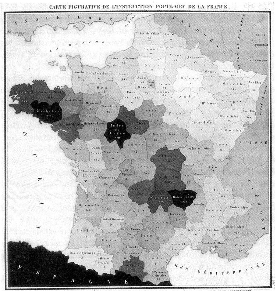 Dupin’s figurative Map of the Popular Instruction of France above is the world’s first choropleth map3, depicting the availability of basic education in France by department. In it, he highlights the aforementioned the Saint-Malo-Geneva line, showing the “enlightened France” of the North and the “dark France” of the South.